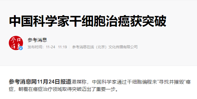 參考消息網(wǎng)11月24日報(bào)道港媒稱,中國科學(xué)家通過干細(xì)胞編程來“尋找并摧毀”癌癥,朝著在癌癥治療領(lǐng)域取得突破邁出了重要一步。據(jù)…
