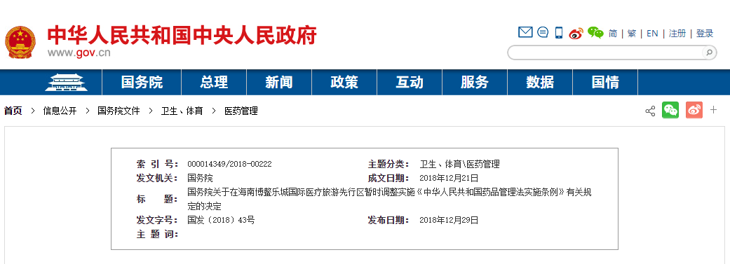 近日,國務(wù)院發(fā)布《關(guān)于在海南博鰲樂城國際醫(yī)療旅游先行區(qū)暫時(shí)調(diào)整實(shí)施<中華人民共和國藥品管理法實(shí)施條例>有關(guān)規(guī)定的決定》。國務(wù)院決定,在海南博鰲樂城國際醫(yī)療旅游先行區(qū)暫時(shí)調(diào)整實(shí)施《中華人民共和國藥品管理法實(shí)施條例》第三十六條的規(guī)定,對先行…