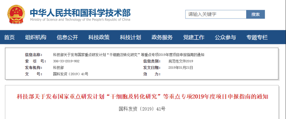2019年1月21日,我國科技部官網(wǎng)正式發(fā)布了“干細(xì)胞及轉(zhuǎn)化研究”重點(diǎn)專項(xiàng)2019年度項(xiàng)目申報(bào)指南,指南中明確:在之前已支持98個(gè)項(xiàng)目的基礎(chǔ)上,2019年國家再撥款4億元,支持12個(gè)干細(xì)胞研究方向。其中干細(xì)胞資源庫、干細(xì)胞治療性腺衰老也寫入申報(bào)指南。指南中明確…